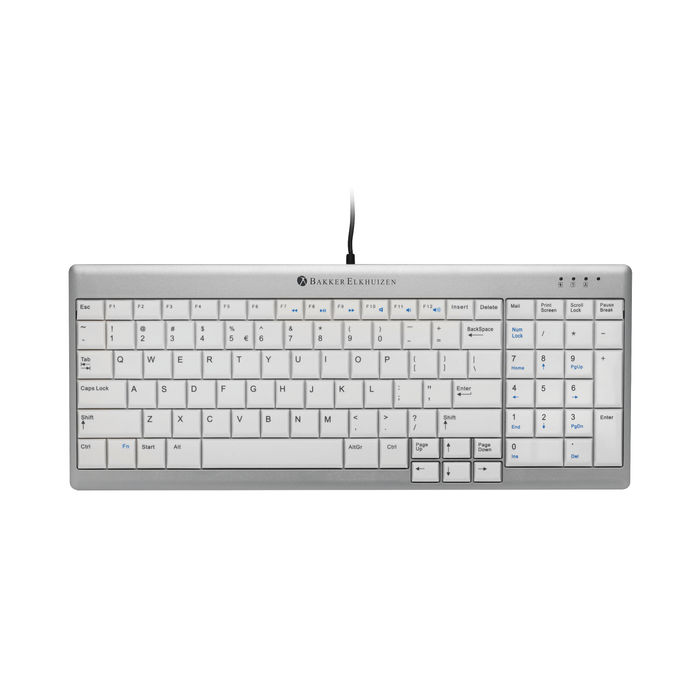 The BakkerElkhuizen UltraBoard 960 is a compact keyboard with a numerical keypad. The main difference compared to a standard keyboard is that the UltraBoard 960 is 8cm narrower than a normal keyboard. Using a compact keyboard reduces the distance to your mouse, which in turn limits the strain on your lower arms. As an added advantage, this compact version is easier to take with you in a backpack or laptop case. The keys of this compact keyboard feature a light background and dark letters, which offers the ergonomic benefits of improved contrast and reduced reflection. The UltraBoard 960 also features two USB ports.