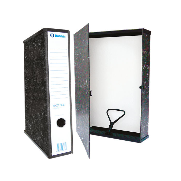 This Banner Rigid Box File features durable plastic ends for long lasting, archival filing. The box file has a 70mm filing capacity, large labelling area and finger ring pull for easy removal from a shelf. The paper over board construction has a stylish cloud effect finish. This pack contains 10 box files.