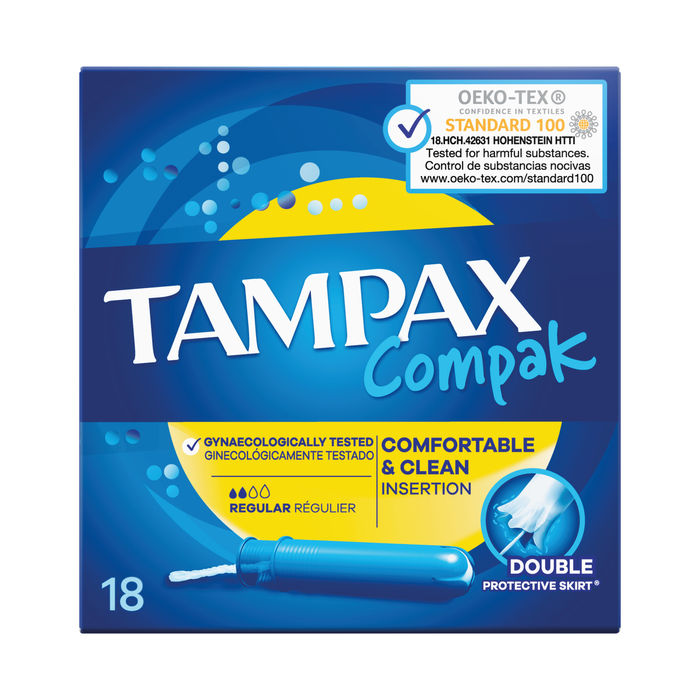 Tampax Compak Regular tampons offer protection and discretion for light to medium flow days during your period. Free from fragrances and dyes. Tampax Compak tampons come with a compact and discreet plastic applicator and a rounded tip for comfortable insertion. With absorption channels to absorb directly to the core and a protective skirt to help prevent leaks for a worry free period. Tampax Compak tampons have been gynaecologically tested, independently tested for harmful substances by Oeko-Tex. Trusted leak-free protection.